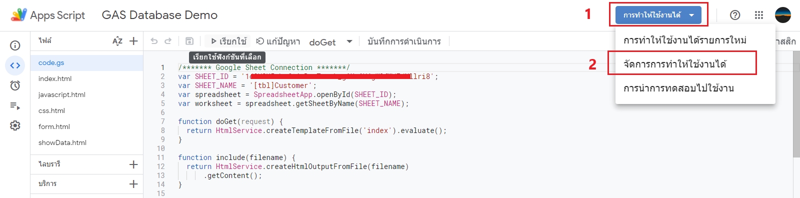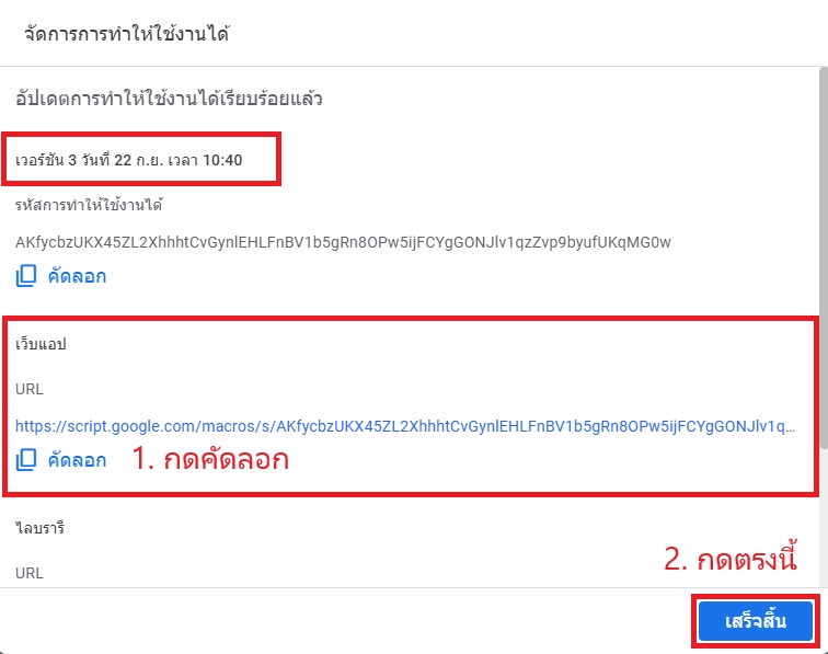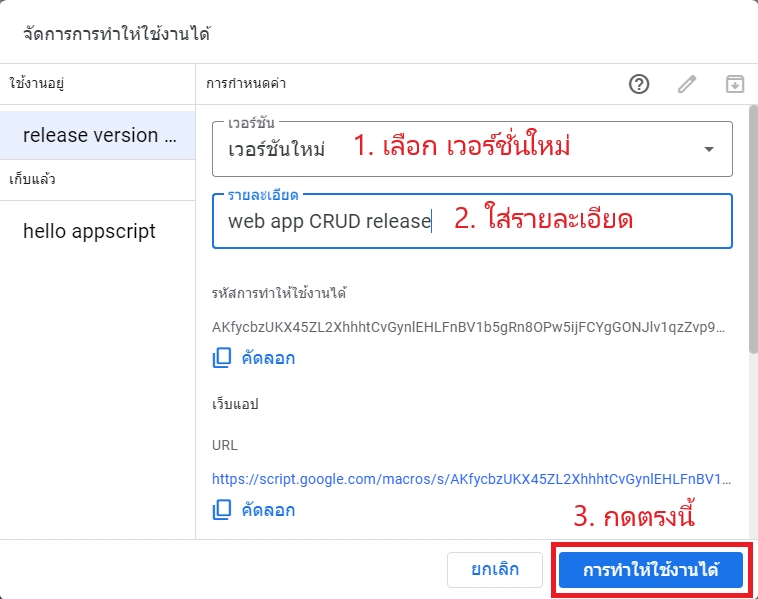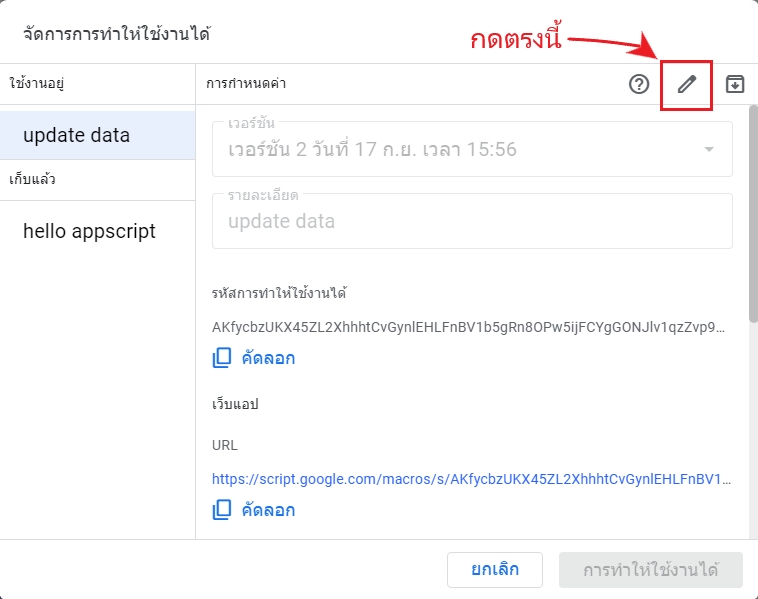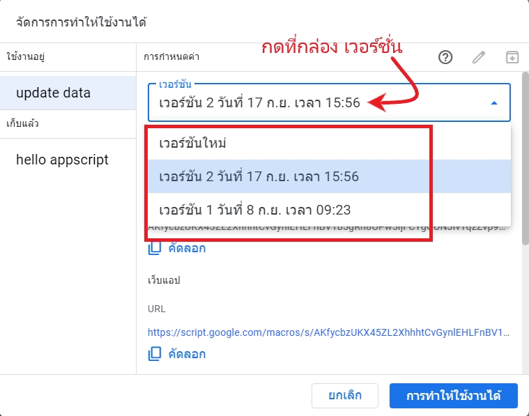 คราวนี้หากแน่ใจแล้วว่าสคริปต์ของเราสมบูรณ์พร้อมจะเผยแพร่ให้องค์กรนำไปใช้งาน เราต้อง จัดการการทำให้ใช้งานได้ เพื่อให้สคริปต์ที่เราปรับปรุงขึ้นใหม่ ถูกบรรจุเข้าในเว็บแอปที่เผยแพร่ไปแล้ว ให้สามารถแสดงผลส่วนที่เราได้เพิ่มเติมเข้าไป โดยใช้ลิงค์เดิม ดังนี้