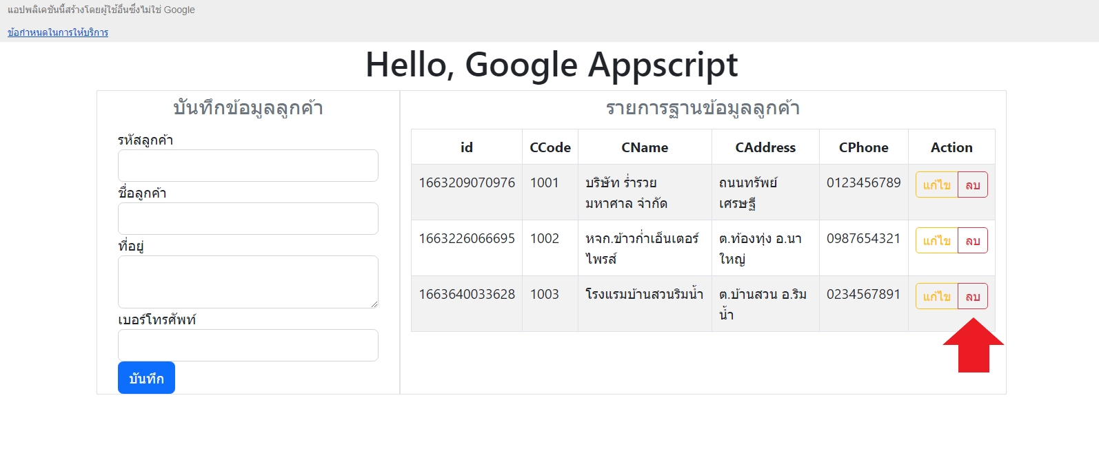 getData() เพิ่มปุ่ม ลบ ข้อมูลเปิดไฟล์ javascript.html มองหาฟังก์ชั่น getData(values) อยู่ในส่วน *** READ *** แก้ไขสคริปต์ให้เป็นดังนี้