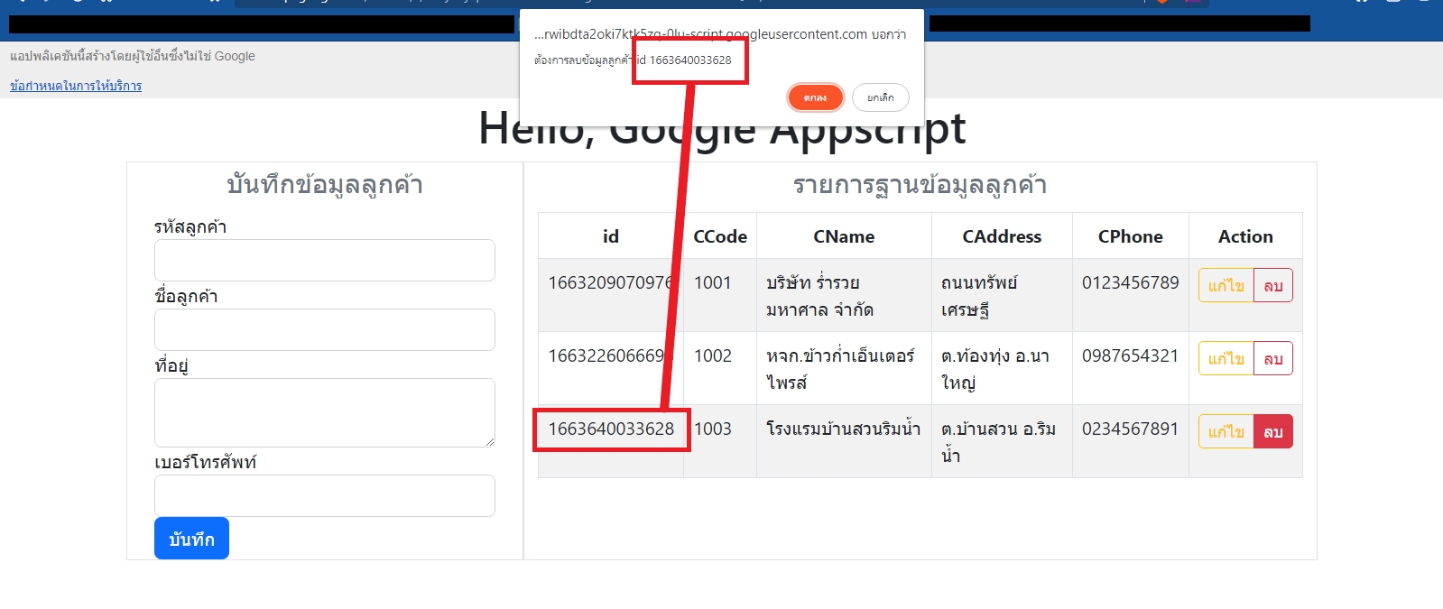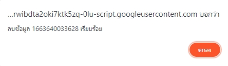 google.script.run.withSuccessHandler(goAlert).deleteData(id); เพื่อส่งคำขอให้เซิร์ฟเวอร์ดำเนินการลบข้อมูล เมื่อเซิร์ฟเวอร์ลบข้อมูลแล้วจะส่งคำตอบกลับมา ฟังก์ชั่นจะส่งคำตอบไปแสดงผลที่ฟังก์ชั่น goAlert() ดังที่เคยแนะนำไว้ในบทบันทึกก่อนหน้านี้