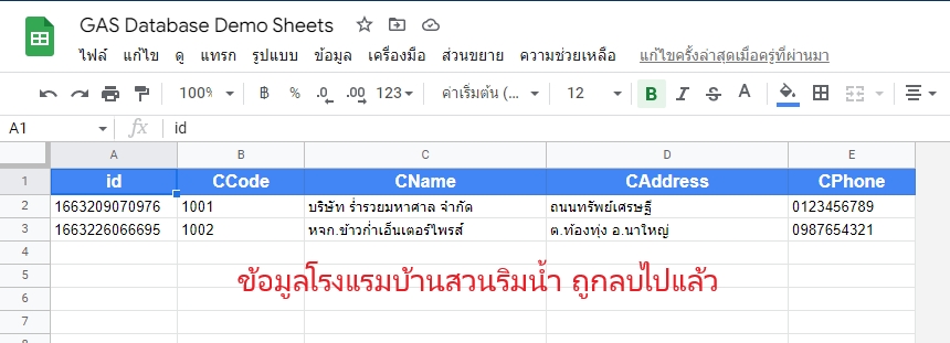 deleteData(id)เปิดไฟล์ code.gs เพิ่มสคริปต์นี้ลงไป